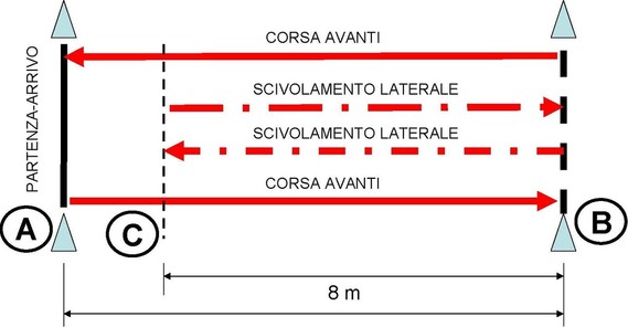 In pratica l’Assistente Arbitro posizionato in A dovrà sprintare sino a B mediante corsa avanti (10 m.) e quindi una volta toccata con un piede la linea, spostarsi da B a C mediante scivolamento laterale (8 m.). Una volta toccata la linea in C con un piede, l’Assistente Arbitro riguadagnerà la linea in B (8 m.) sempre con spostamento laterale.